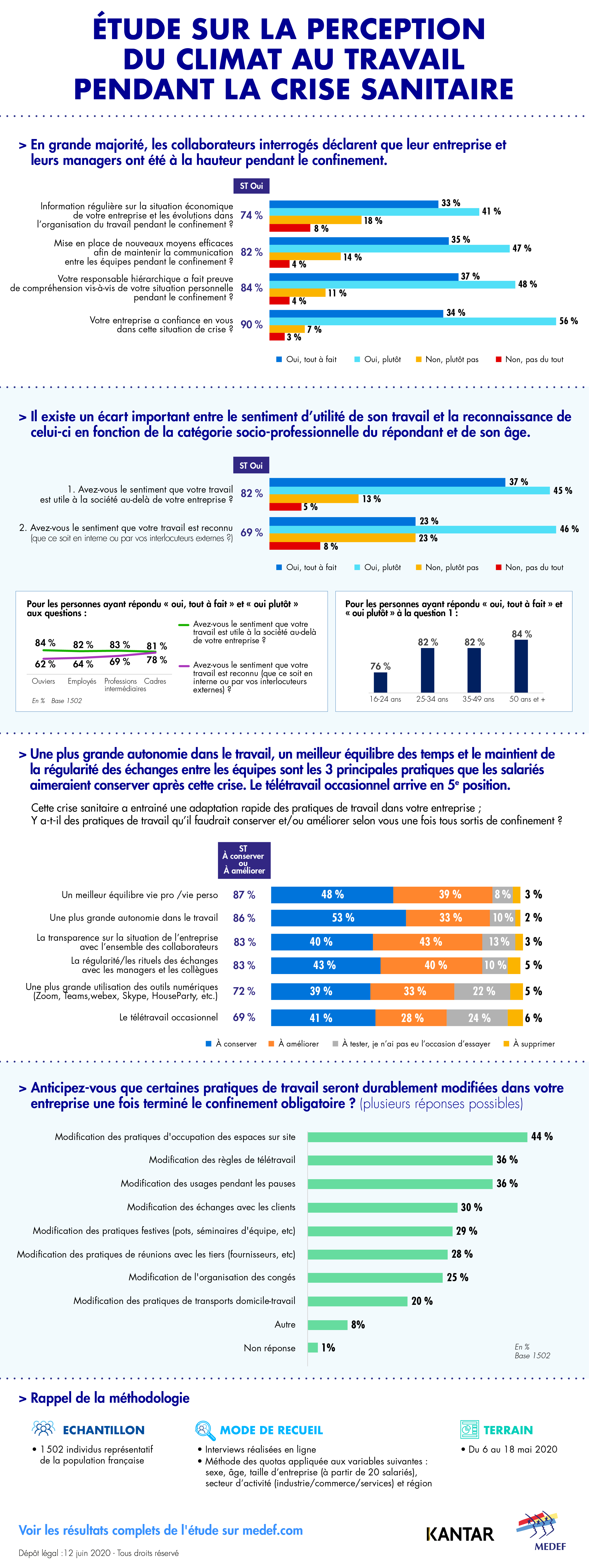 Le MEDEF a réalisé deux enquêtes lors de la crise sanitaire afin de mieux comprendre l’impact que celle-ci a eu sur l’état d’esprit des chefs d’entreprise et des salariés : l'étude « Les dirigeants face à la crise sanitaire », réalisée avec Supermood auprès de 1203 chefs d’entreprise entre le 27 mai et le 5 juin 2020, et l'étude « Perception du climat au travail pendant la crise sanitaire », réalisée du 6 au 18 mai 2020 par Kantar auprès de 1502 individus, issus d’un échantillon national représentatif de la population française salariée du privé et âgée de 16 ans et plus.
