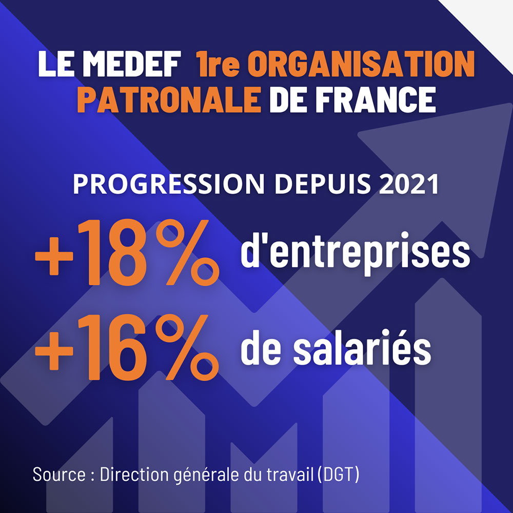 Le Medef enregistre cette année une hausse de 18 % pour le nombre d'entreprises et de 16 % pour le nombre de salariés. Il demeure ainsi la première organisation patronale de France, avec plus d'un salarié du privé sur deux qui travaille dans une entreprise affiliée, ce qui continue à faire de lui la seule organisation patronale à pouvoir s'opposer à l'extension des accords nationaux interprofessionels.