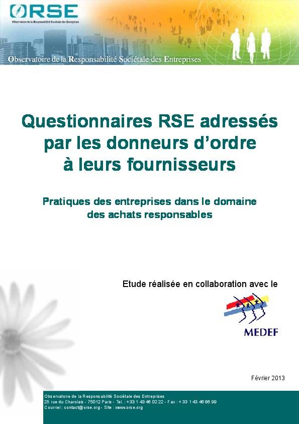 Présenté lors d’une conférence organisée au MEDEF, ce guide intitulé « Questionnaires RSE adressés par les donneurs d’ordre à leurs fournisseurs – pratiques des entreprises dans le domaine des achats responsables...